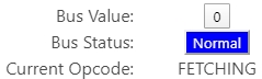 Above the components there are two buttons which represent the current bus value and the bus status of the emulator. (The bus value may not be accurate if the driving component is marked as hardware). Bus status shows whether the bus is floating (yellow), normal (being outputted to, blue), or in conflict (bus conflict, red). The current opcode is also displayed.